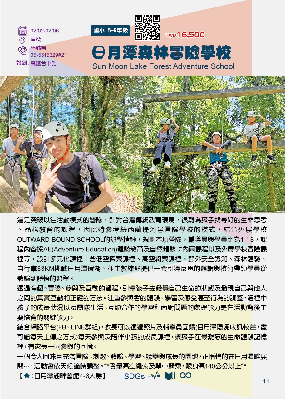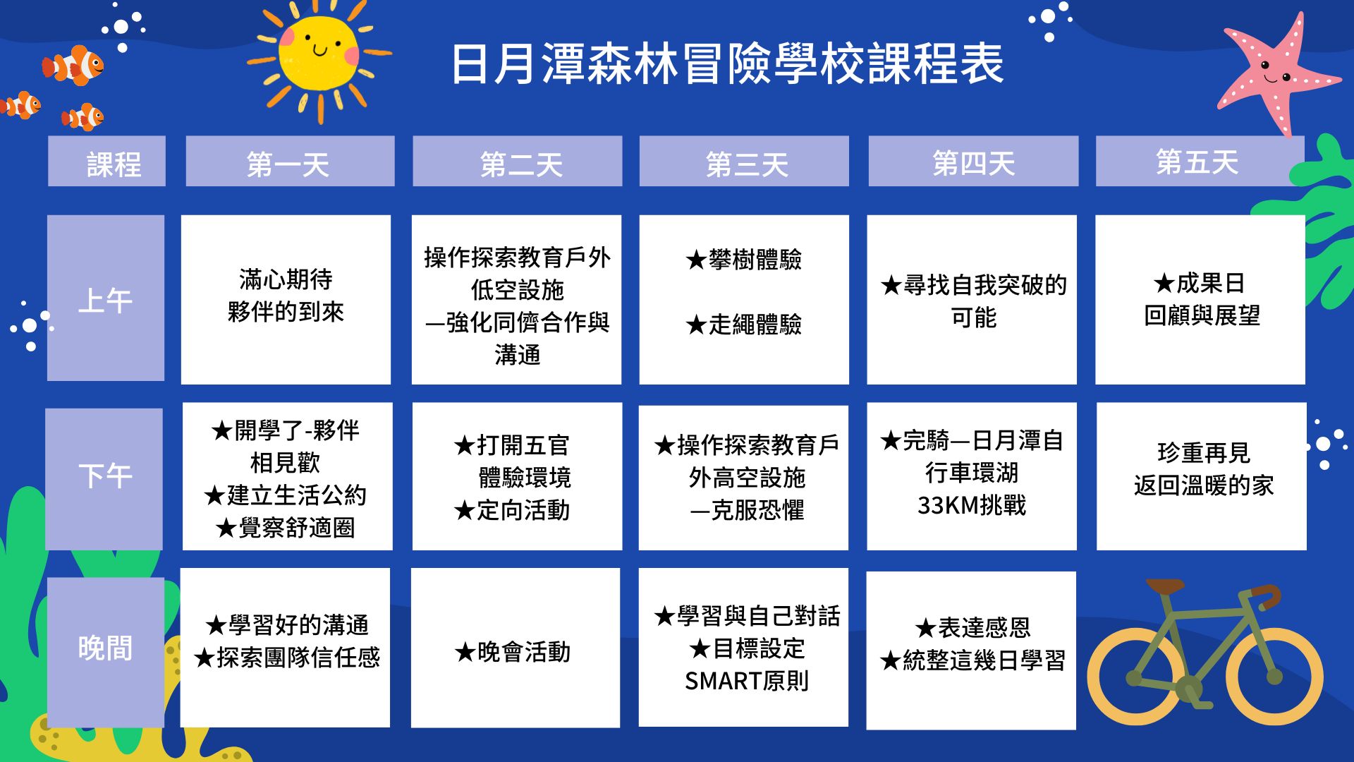 這是突破以往活動模式的營隊,針對台灣傳統教育環境,很難為孩子找尋好的生命思考、品格教育的課程,因此特參考紐西蘭堤河邑冒險學校的模式,結合外展學校OUTWARD BOUND SCHOOL的辦學精神,規劃本項營隊。輔導員與學員比為1:8,課程內容採AE(Adventure Education)體驗教育及自然體驗卡內爾課程以及外展學校冒險課程等,設計多元化課程:含低空探索課程、高空繩索課程、野外安全認知、森林體驗、自行車33KM挑戰日月潭環湖、並由教練群提供一套引導反思的邏輯與技術帶領學員從體驗到體悟的過程。