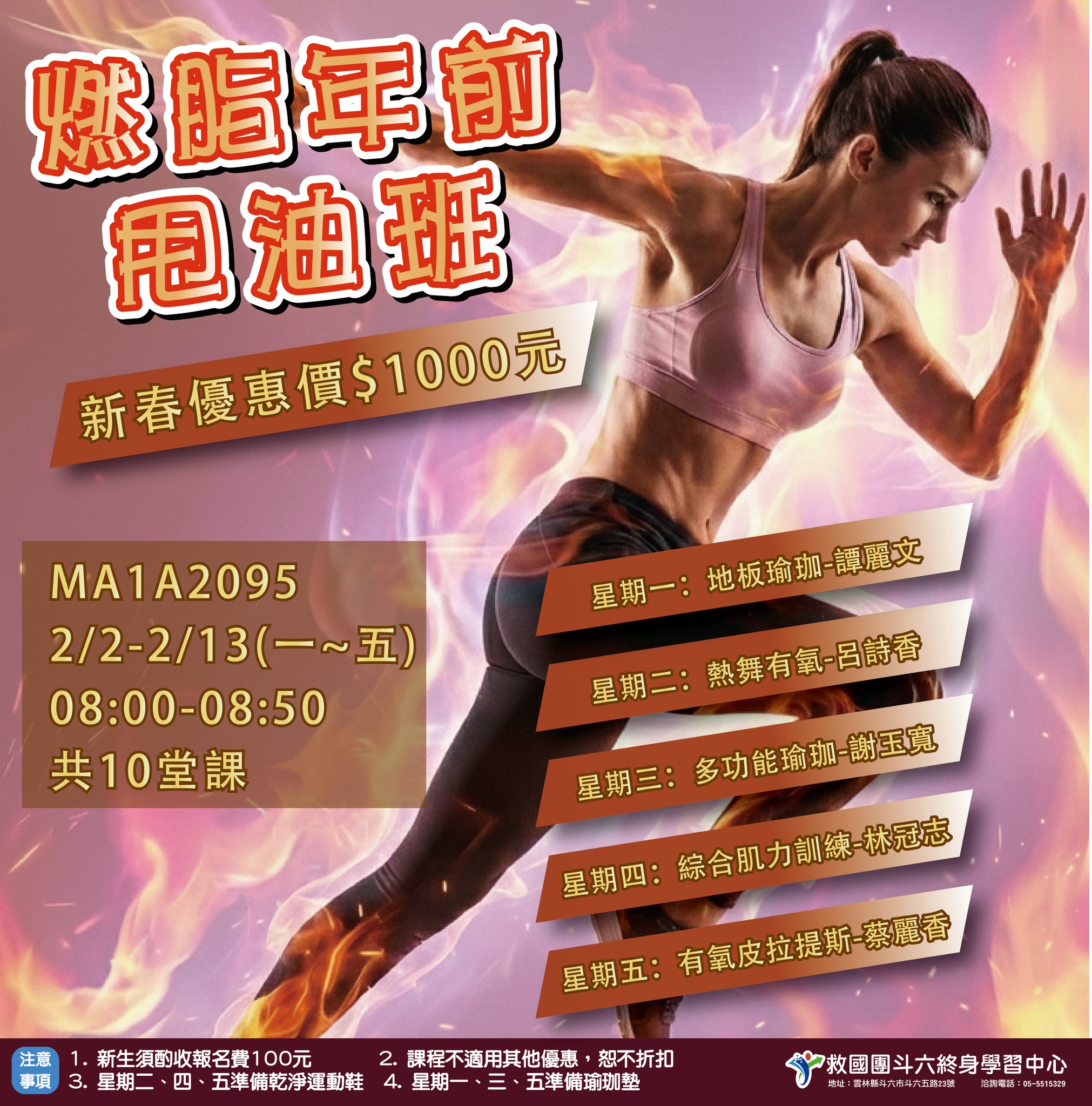 課程時間為早上 08:00 至 08:50,週一至週五上課,共計 10 堂課,內容包含瑜珈、有氧舞蹈、多功能訓練及肌力訓練等,適合想在過年前動起來、調整生活節奏的學員參加。